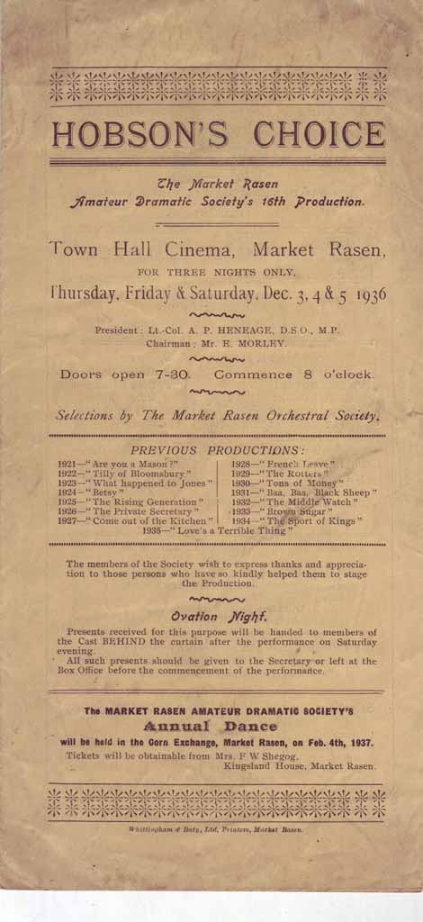 Years later the Market Place Corn Exchange became the Market Rasen Town Hall, and in 1914 a Picturedome [one of the first cinemas] but was sadly pulled down in 1960. The Queen Street Exchange went on to be used for many balls, concerts and meetings. Today it serves as office space, is a Grade II listed building and still boasts many of its original features.